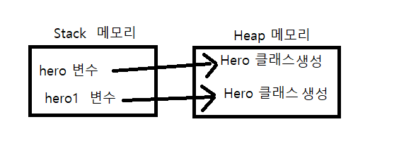 Hero 클래스의 hero와 hero1 인스턴스를 생성하여 출력해보면 아래와 같이 서로 다른 주소값이 나온다.